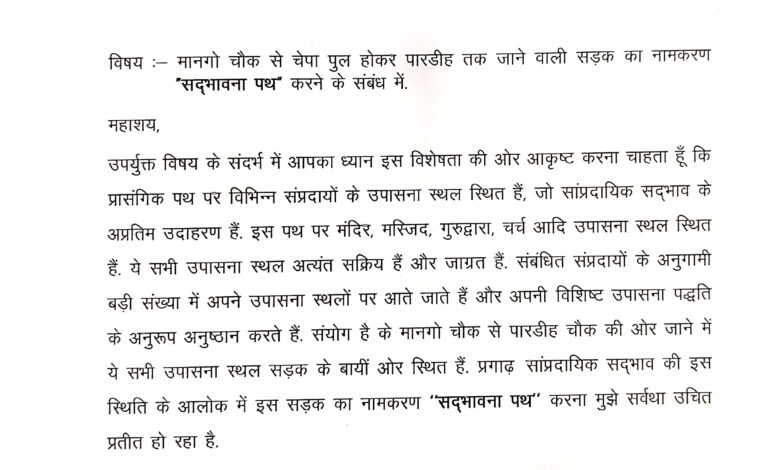पत्र में उन्होंने लिखा है कि संयोग है के मानगो चौक से पारडीह चौक की ओर जाने में ये सभी उपासना स्थल सड़क के बायीं ओर स्थित हैं। प्रगाढ़ सांप्रदायिक सदभाव की इस स्थिति के आलोक में इस सड़क का नामकरण ‘‘सदभावना पथ’’ करना उचित होगा।